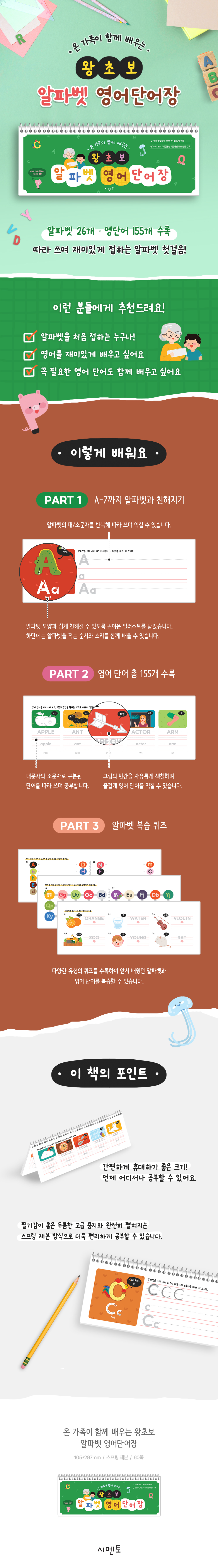 <온 가족이 함께 배우는 왕초보 알파벳 영어단어장>은 영어를 처음부터 차근차근 배우고 싶은 분에서부터 내 아이의 알파벳 공부까지 남녀노소를 가리지 않고, 그 누구나 재밌게 알파벳을 배울 수 있는 공부 책입니다.