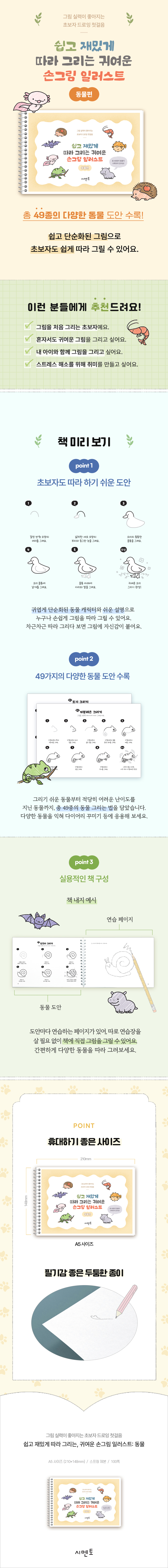 <쉽고 재밌게 따라 그리는, 귀여운 손그림 일러스트: 동물 - 그림 실력이 좋아지는 초보자 드로잉 첫걸음>은 휴대하기 좋은 사이즈 덕분에 장소에 구애받지 않고 취미 생활을 즐길 수 있습니다.